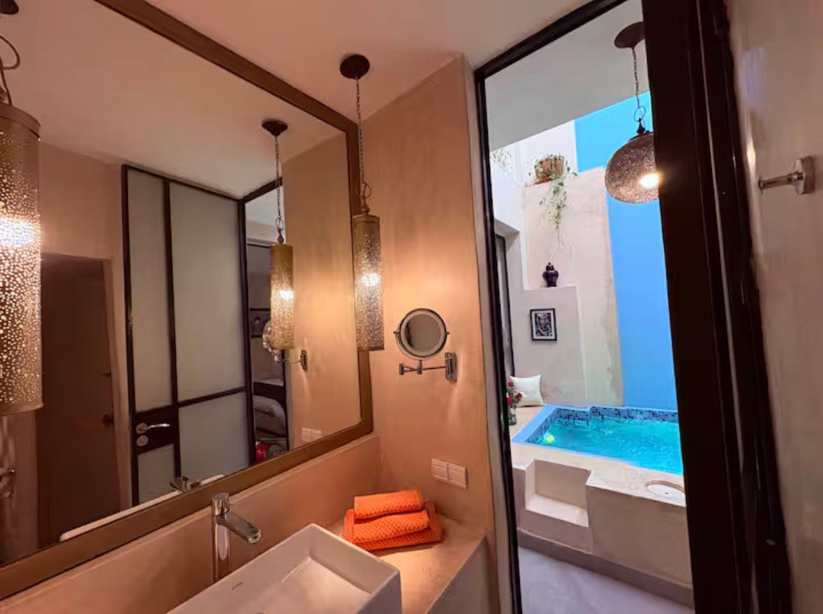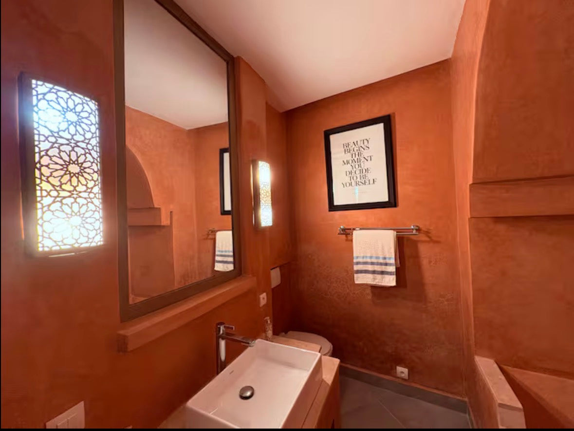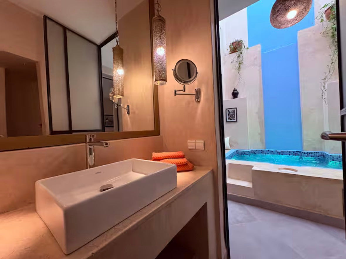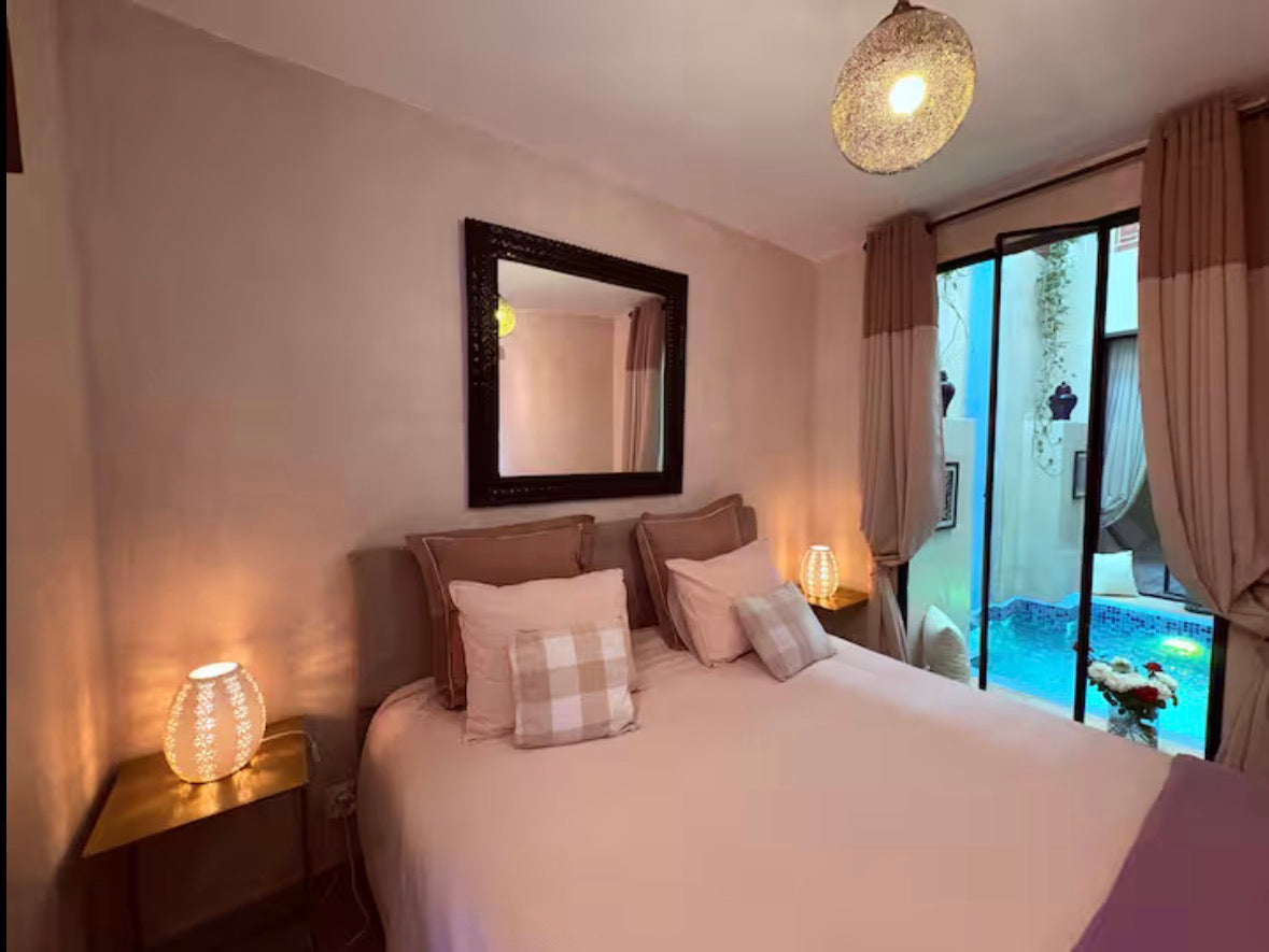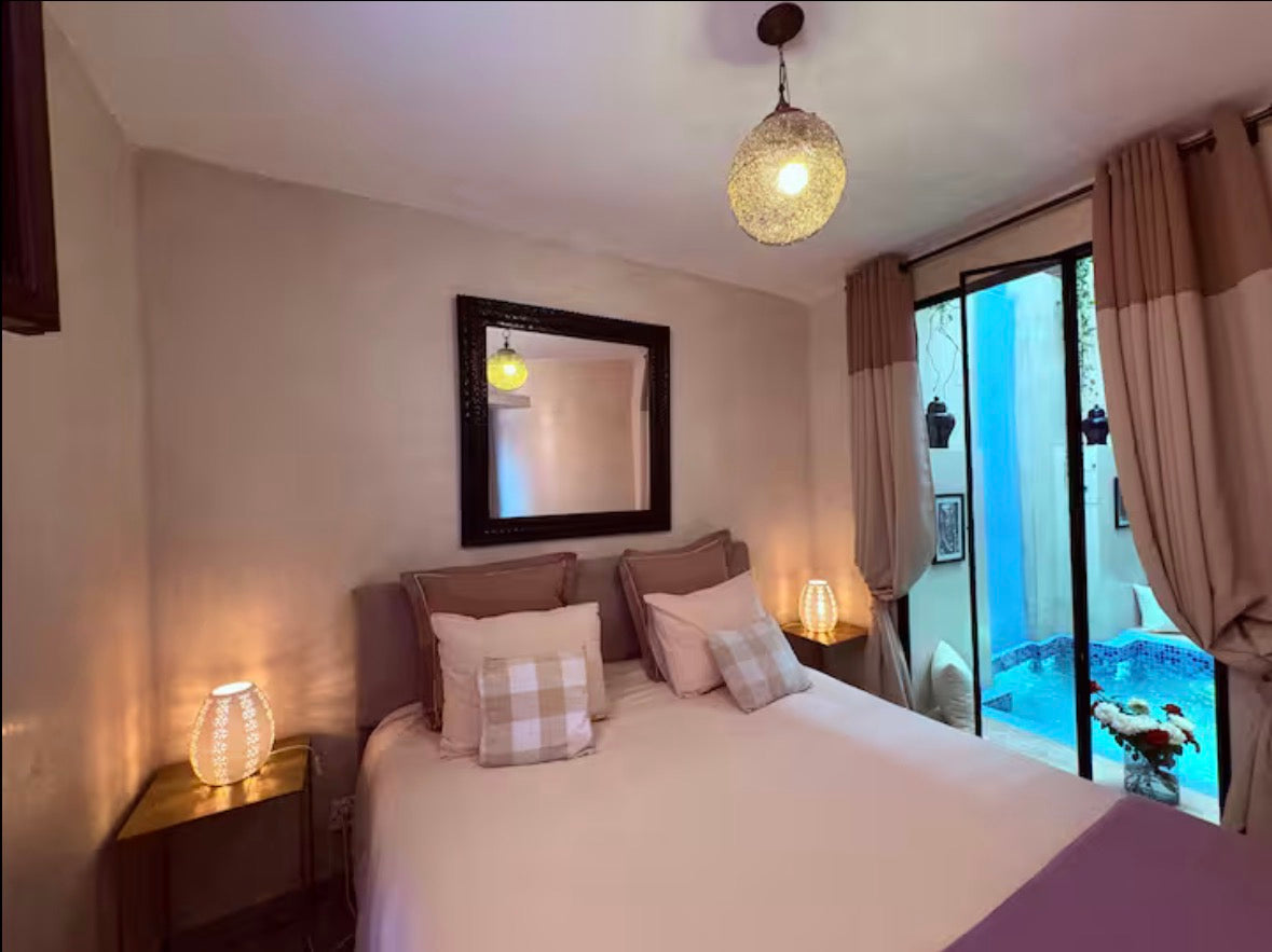 Le riad offre 2 chambres avec 3 SDB, patio avec bassin non chauffé, 2 salons , 1 canapé convertible pour 1 personne, solarium, terrasse