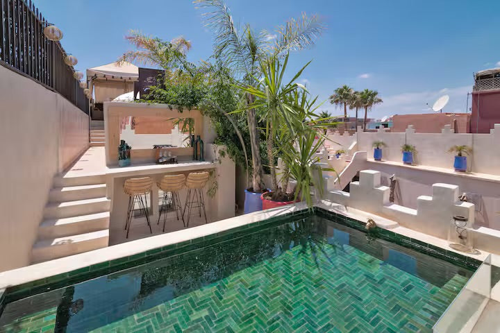 Le riad offre 3 belles chambres avec 2 SDB, patio, 2 salons, solarium, bassin en terrasse ...